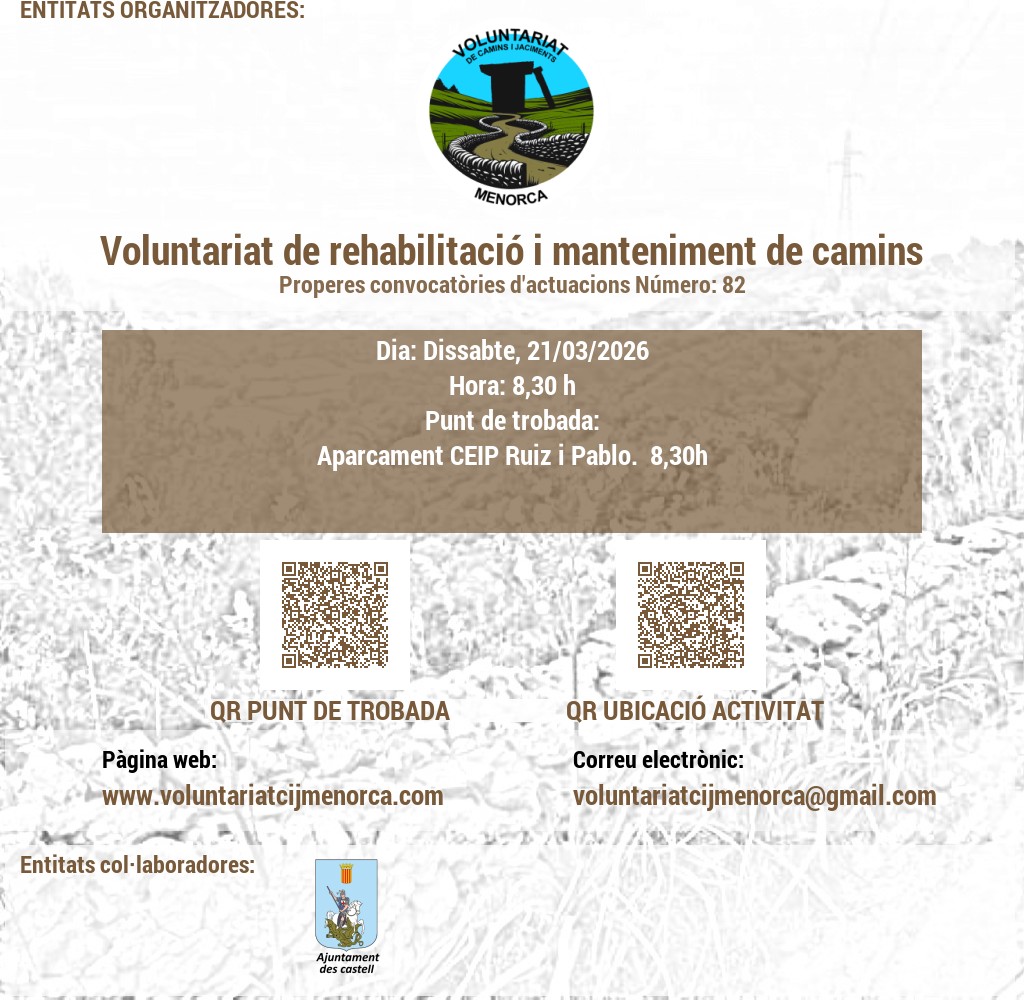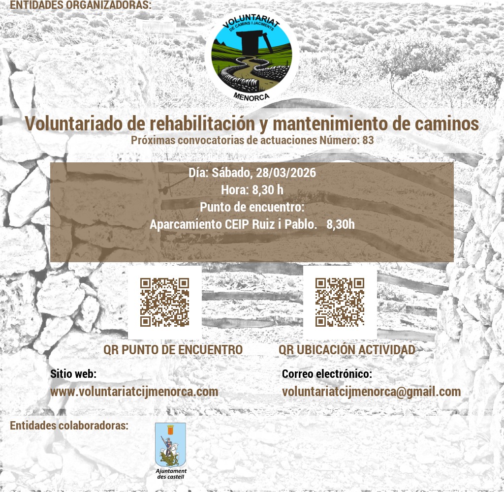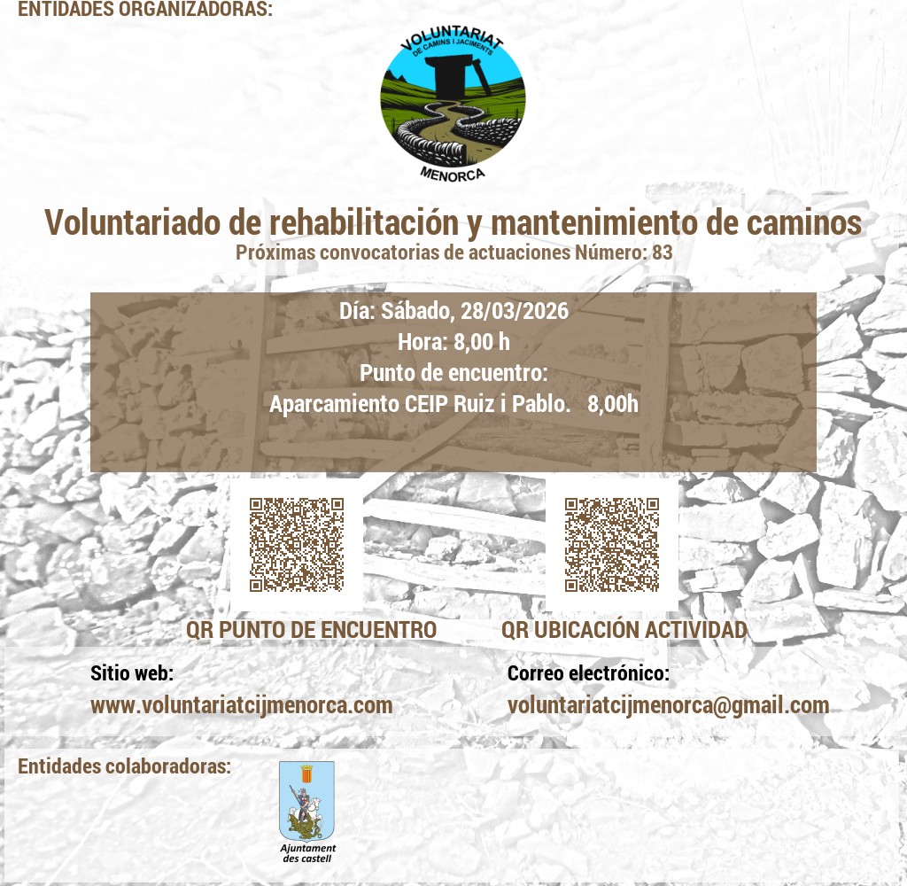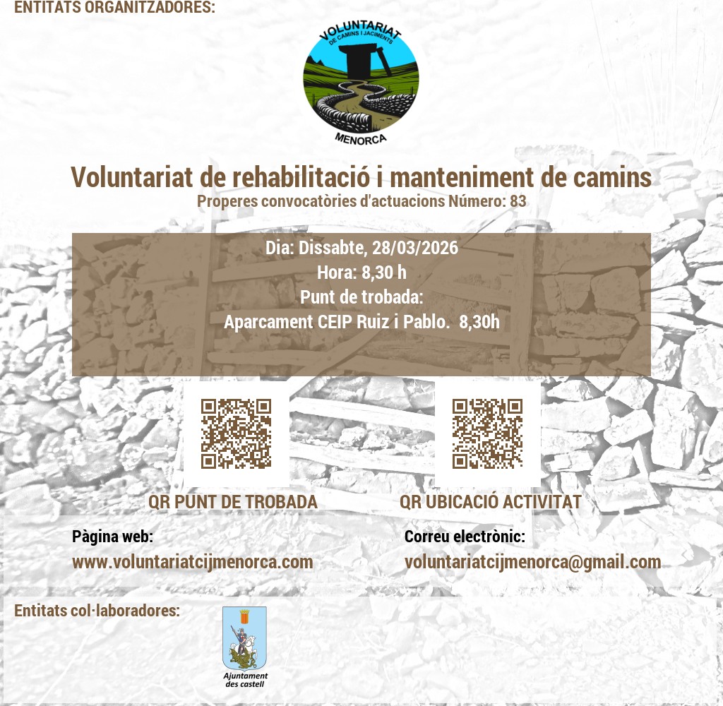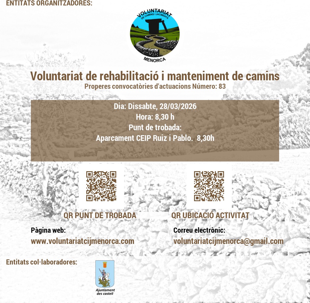 VOLUNTARIAT DE CAMINS I JACIMENTS DE MENORCA Domicili Social:CARRER VICTORI, 52, 07720 ES CASTELL, MENORCA. NIF: G56897317 E-Mail: infocij @ voluntariatcijmenorca.com Lloc Web: www.voluntariatcijmenorca.com