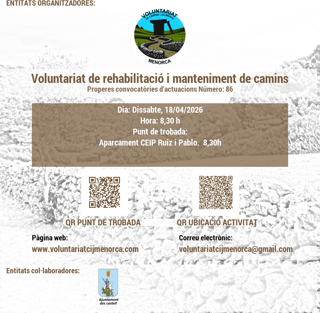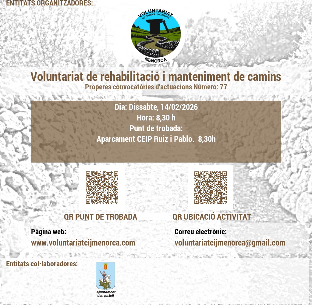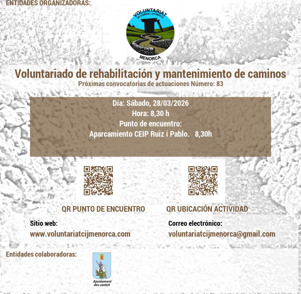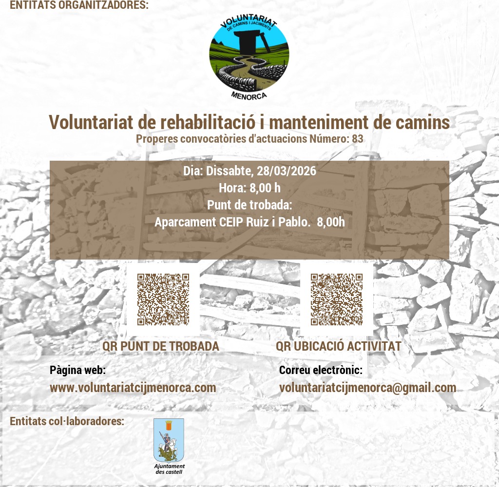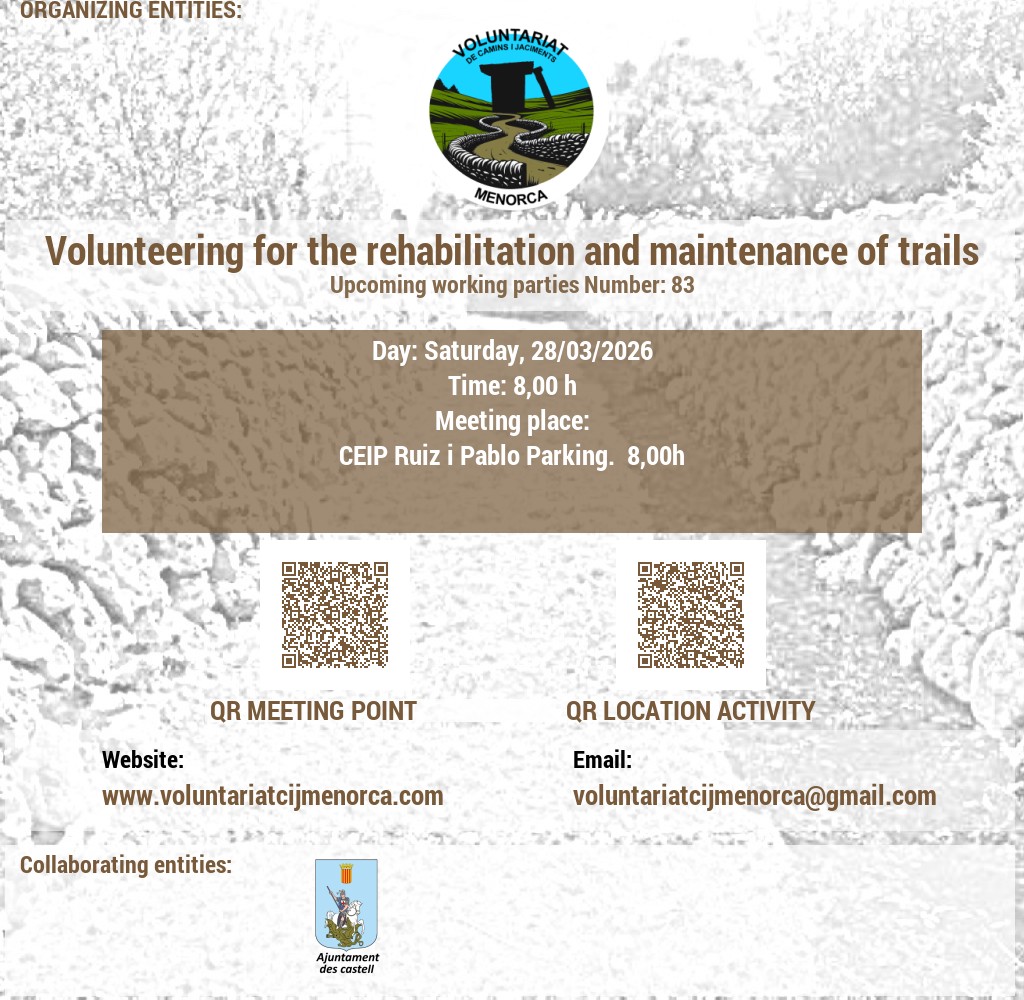 VOLUNTARIAT DE CAMINS I JACIMENTS DE MENORCA Domicili Social:CARRER VICTORI, 52, 07720 ES CASTELL, MENORCA. NIF: G56897317 E-Mail: infocij @ voluntariatcijmenorca.com Lloc Web: www.voluntariatcijmenorca.com