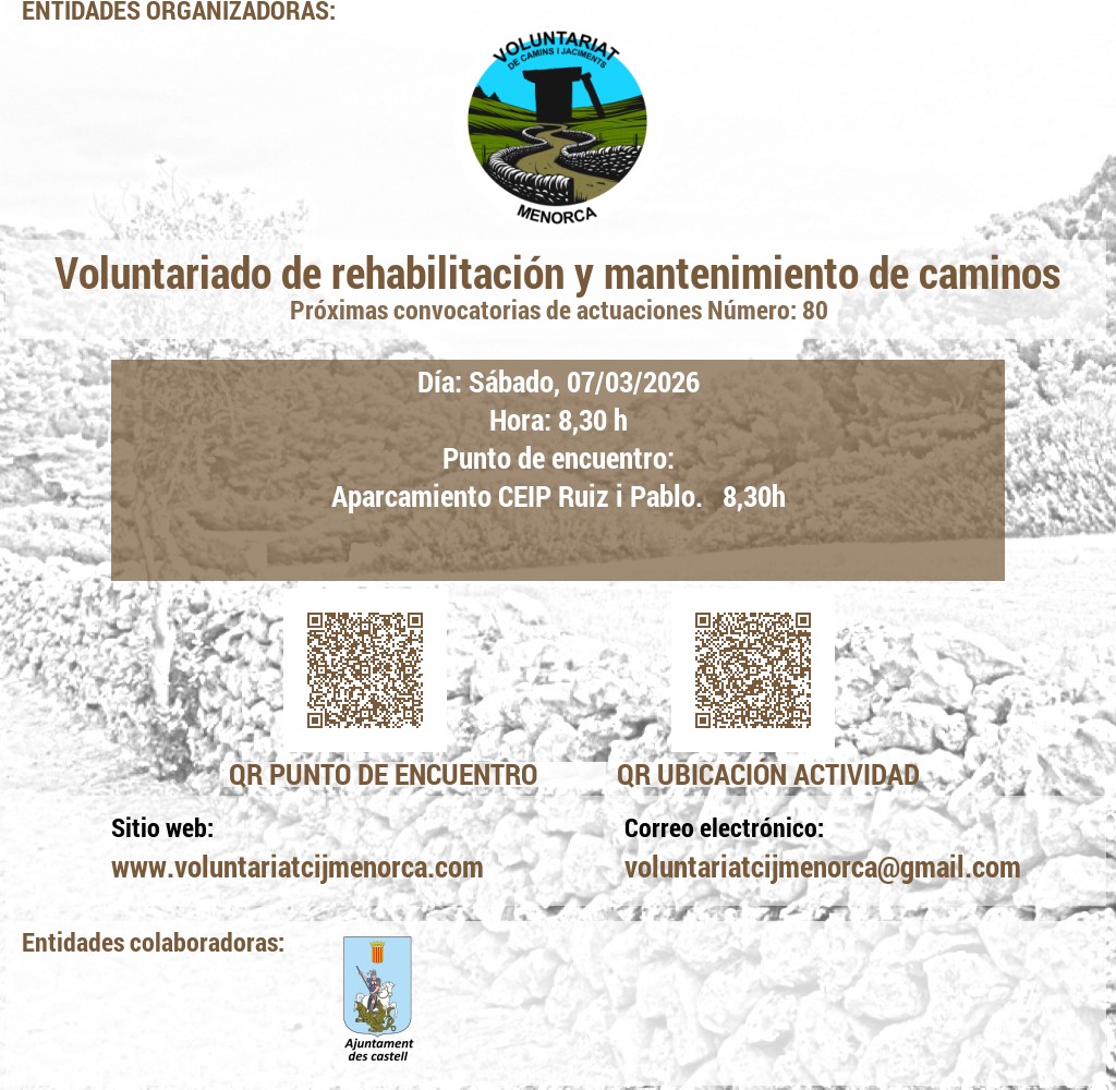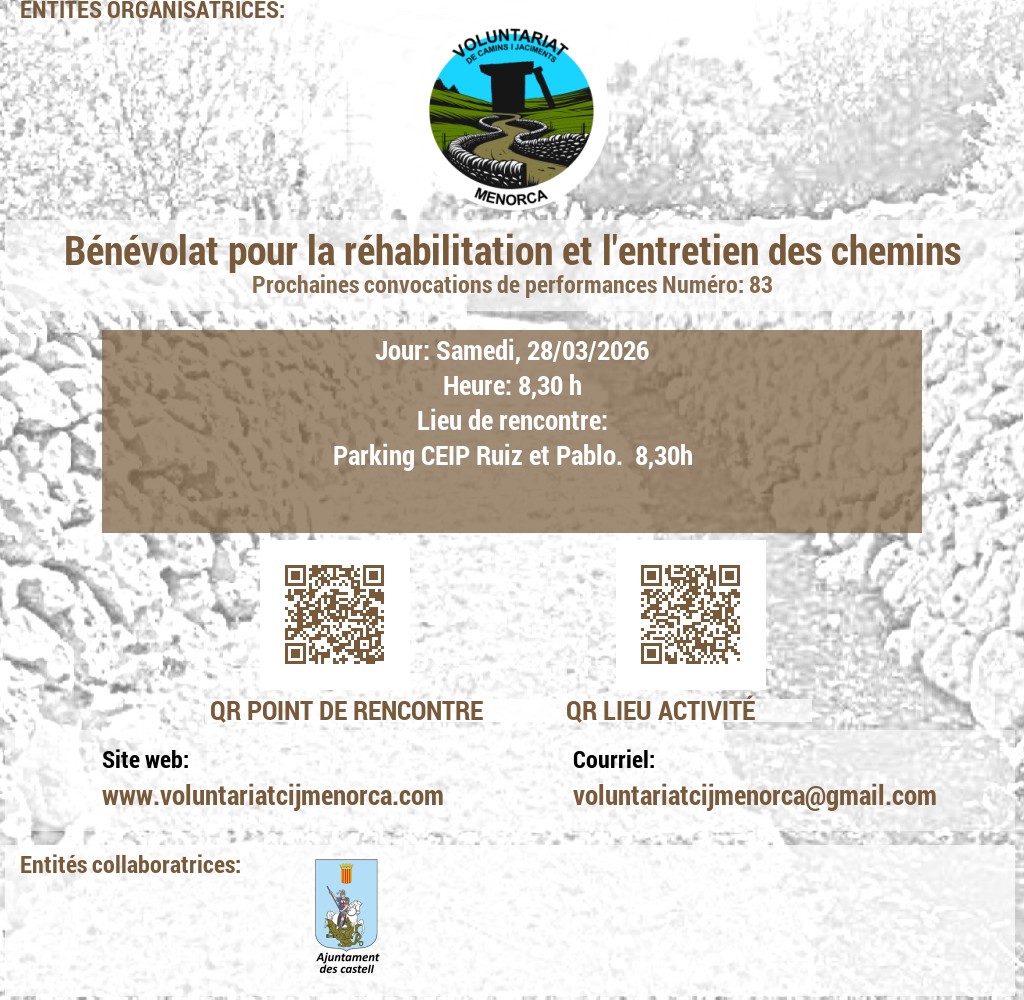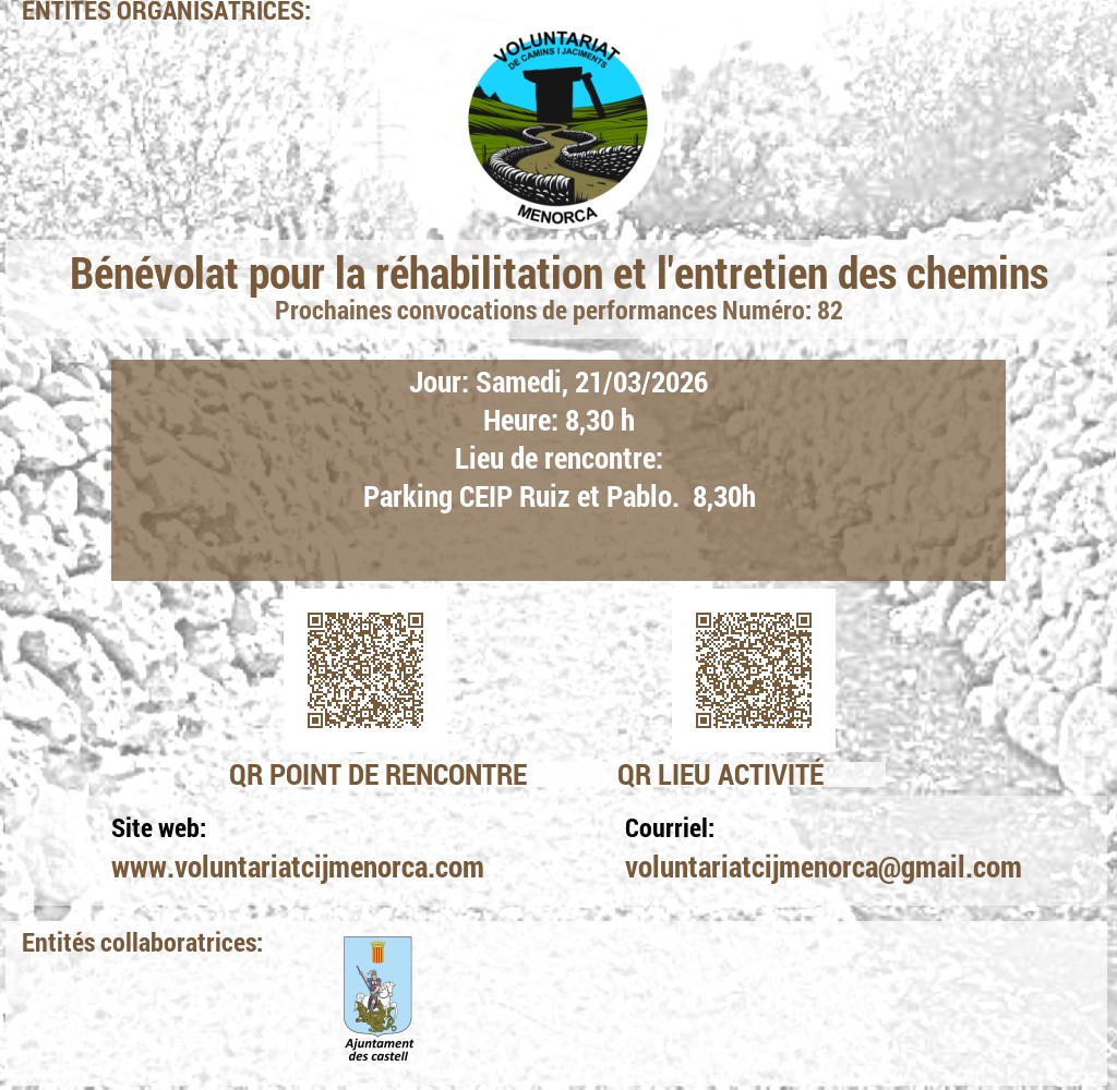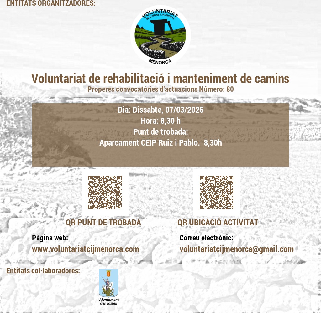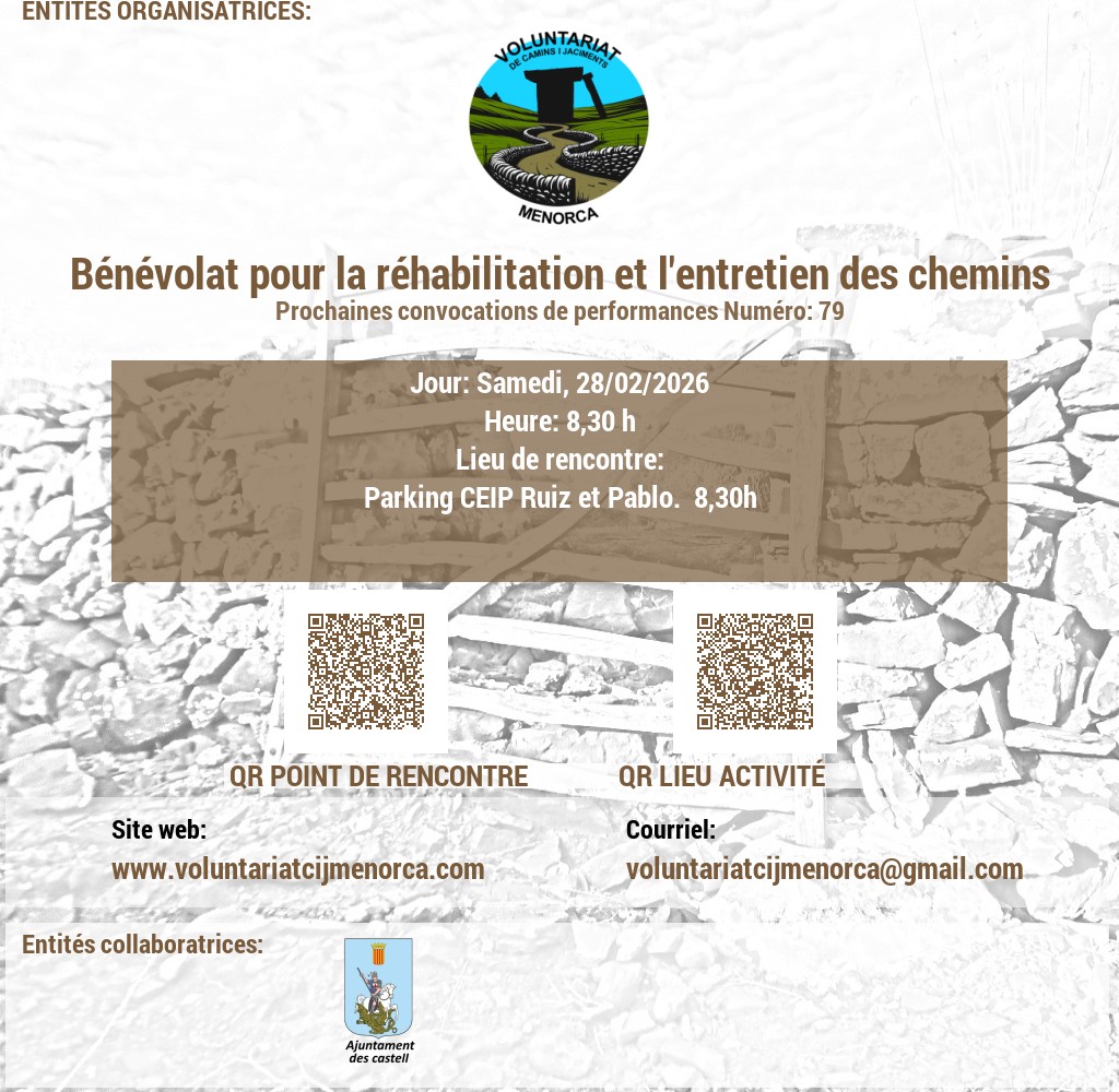 VOLUNTARIAT DE CAMINS I JACIMENTS DE MENORCA Domicili Social:CARRER VICTORI, 52, 07720 ES CASTELL, MENORCA. NIF: G56897317 E-Mail: infocij @ voluntariatcijmenorca.com Lloc Web: www.voluntariatcijmenorca.com