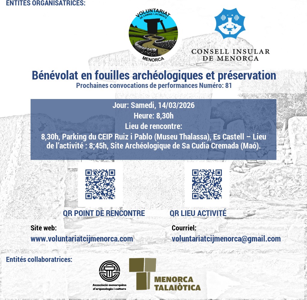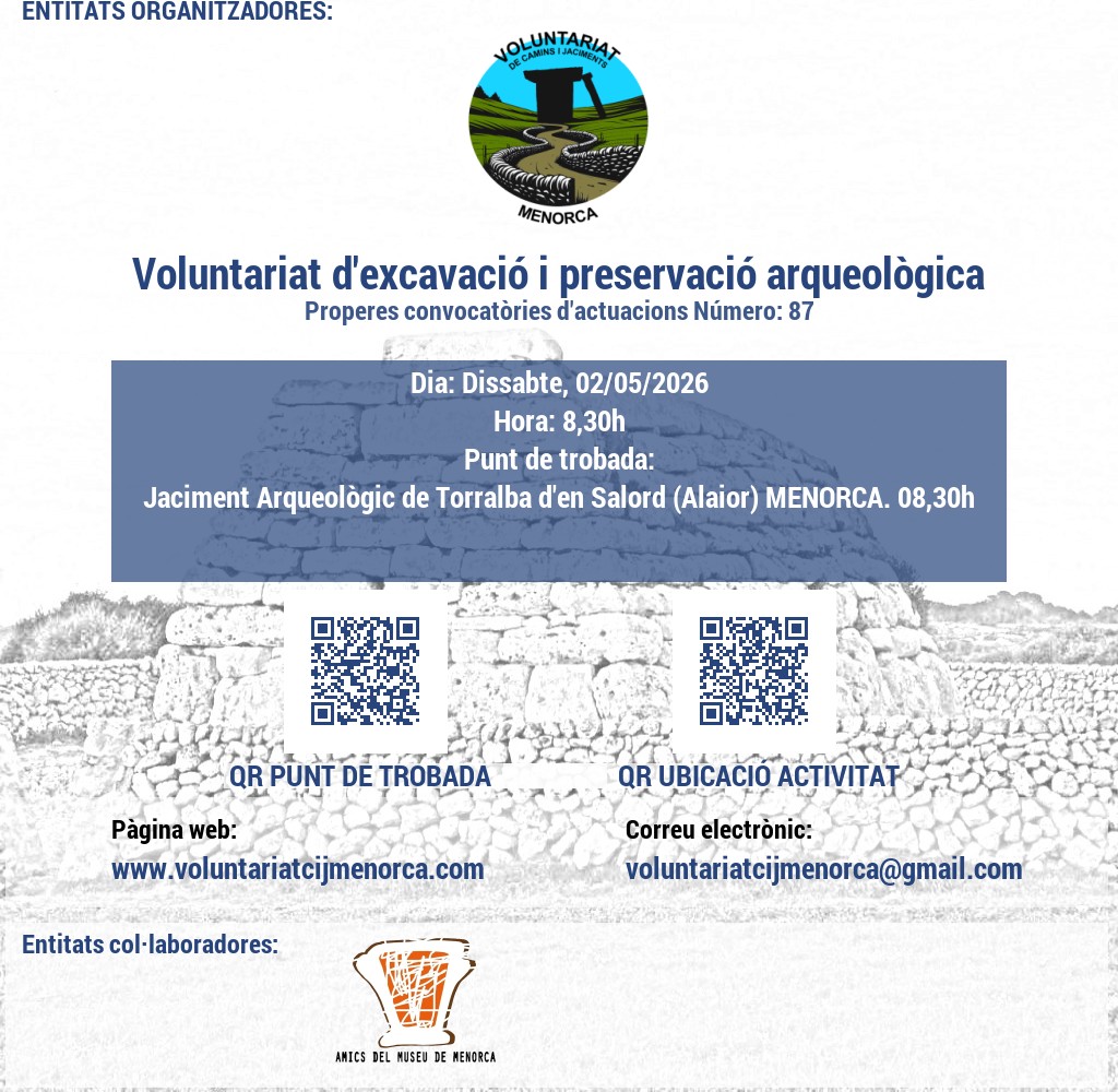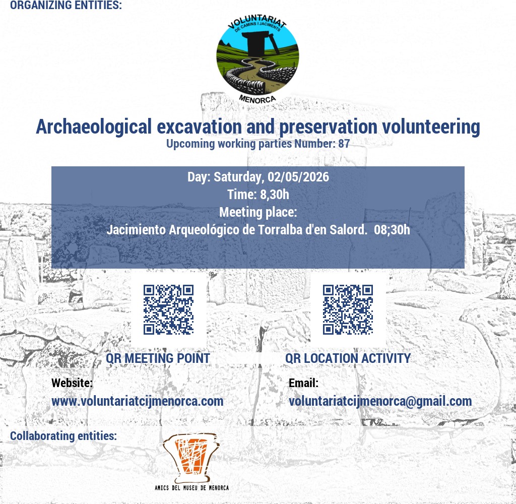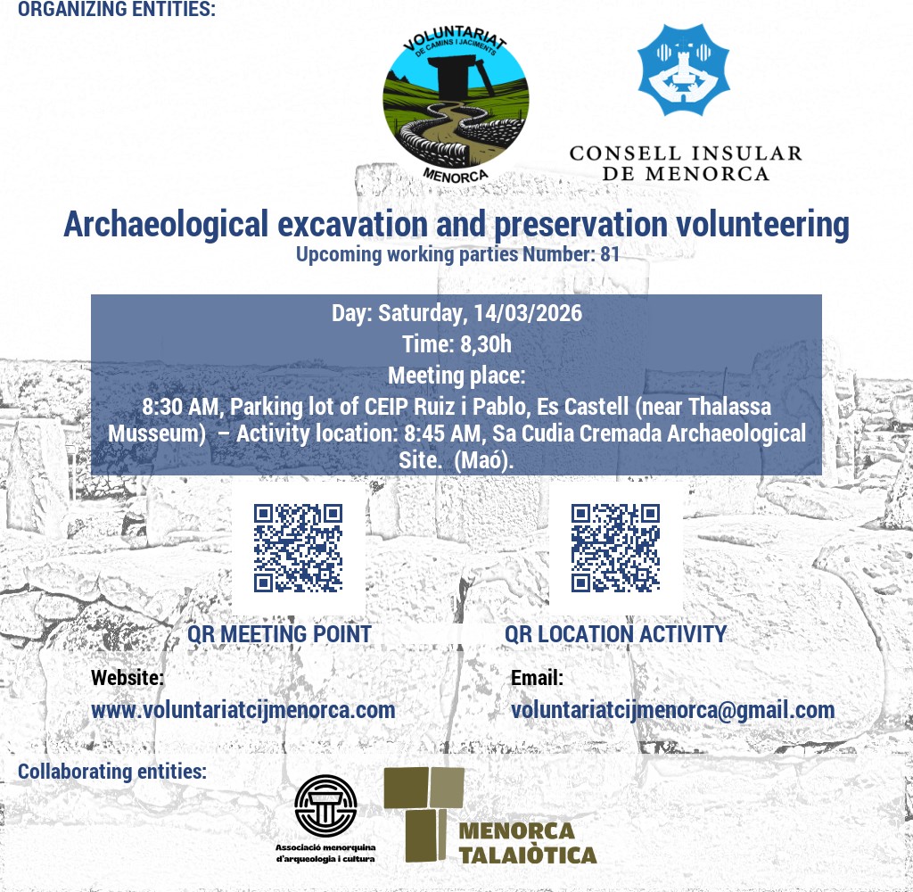 Estem buscant voluntaris apassionats per l'arqueologia i la conservació del patrimoni. Uneix-te a nosaltres en l'emocionant tasca de recuperar jaciments talaiòtics, on podràs contribuir a la preservació de la valuosa història de Menorca mitjançant activitats de neteja i treballs arqueològics puntuals. A més, et convidem a participar en l'obertura i manteniment de camins, desbrossant senders que connecten amb el passat de l'illa. La teva ajuda és crucial per mantenir viva l'herència cultural de Menorca!