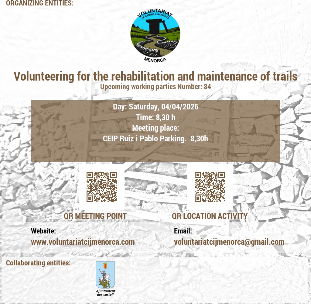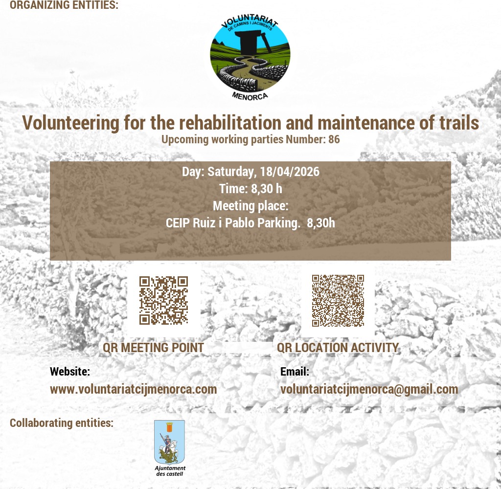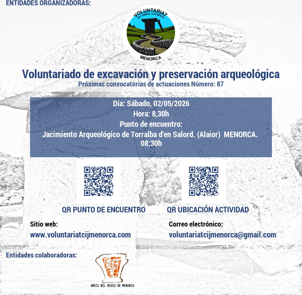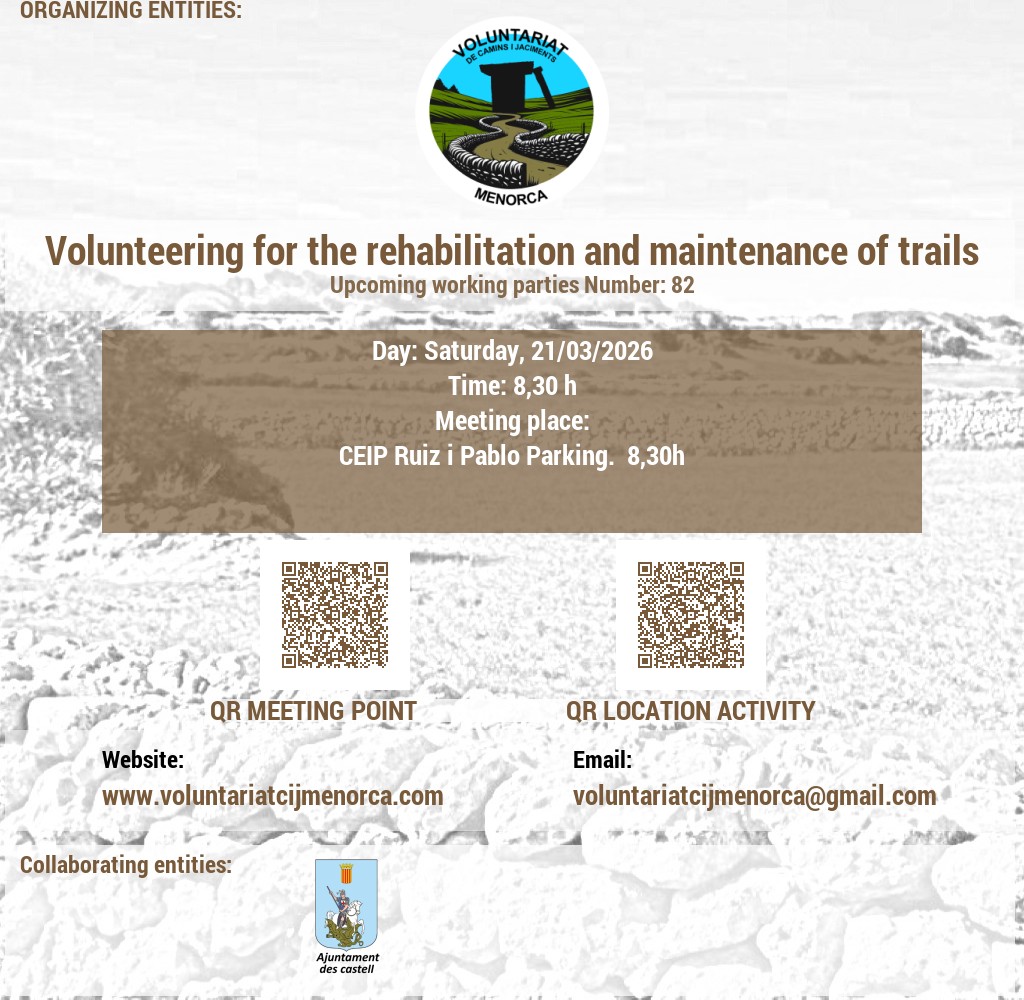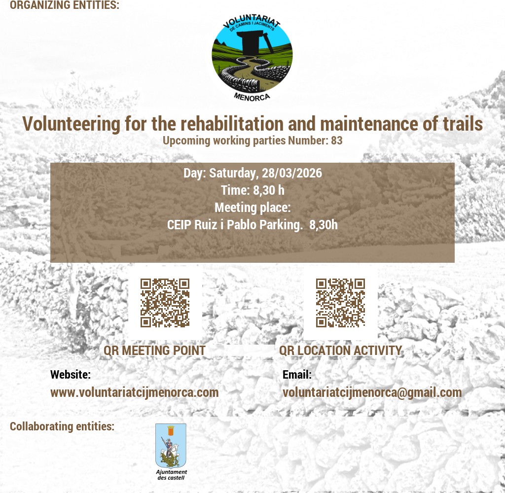 Estem buscant voluntaris apassionats per l'arqueologia i la conservació del patrimoni. Uneix-te a nosaltres en l'emocionant tasca de recuperar jaciments talaiòtics, on podràs contribuir a la preservació de la valuosa història de Menorca mitjançant activitats de neteja i treballs arqueològics puntuals. A més, et convidem a participar en l'obertura i manteniment de camins, desbrossant senders que connecten amb el passat de l'illa. La teva ajuda és crucial per mantenir viva l'herència cultural de Menorca!