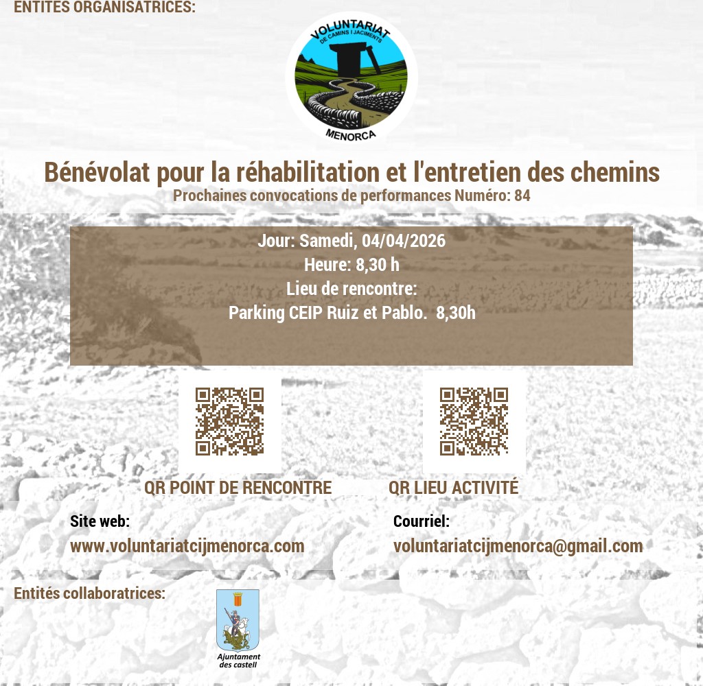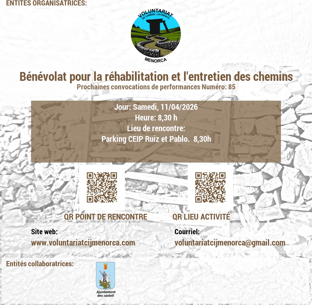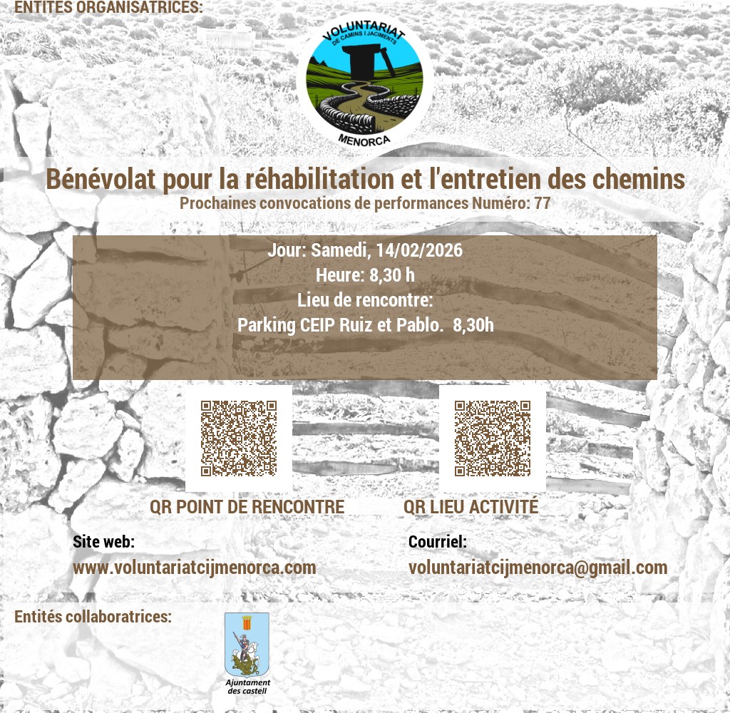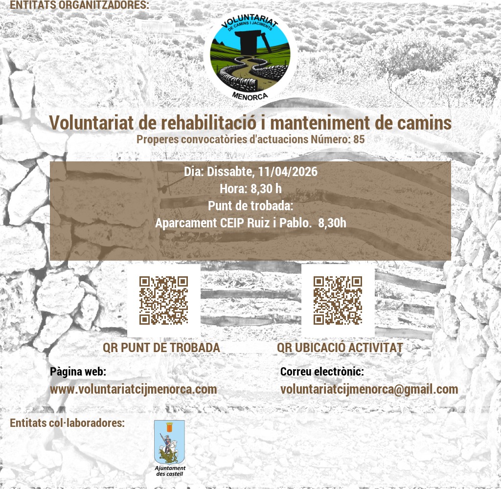 Estem buscant voluntaris apassionats per l'arqueologia i la conservació del patrimoni. Uneix-te a nosaltres en l'emocionant tasca de recuperar jaciments talaiòtics, on podràs contribuir a la preservació de la valuosa història de Menorca mitjançant activitats de neteja i treballs arqueològics puntuals. A més, et convidem a participar en l'obertura i manteniment de camins, desbrossant senders que connecten amb el passat de l'illa. La teva ajuda és crucial per mantenir viva l'herència cultural de Menorca!