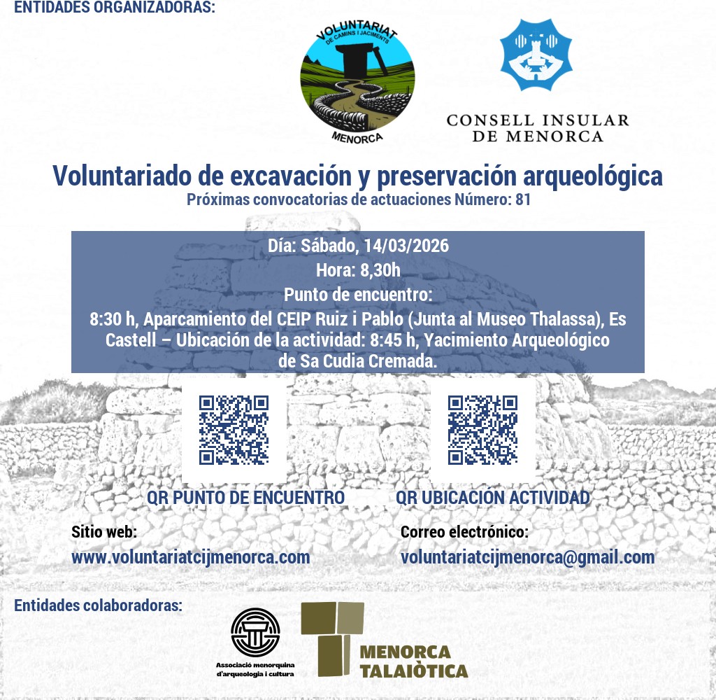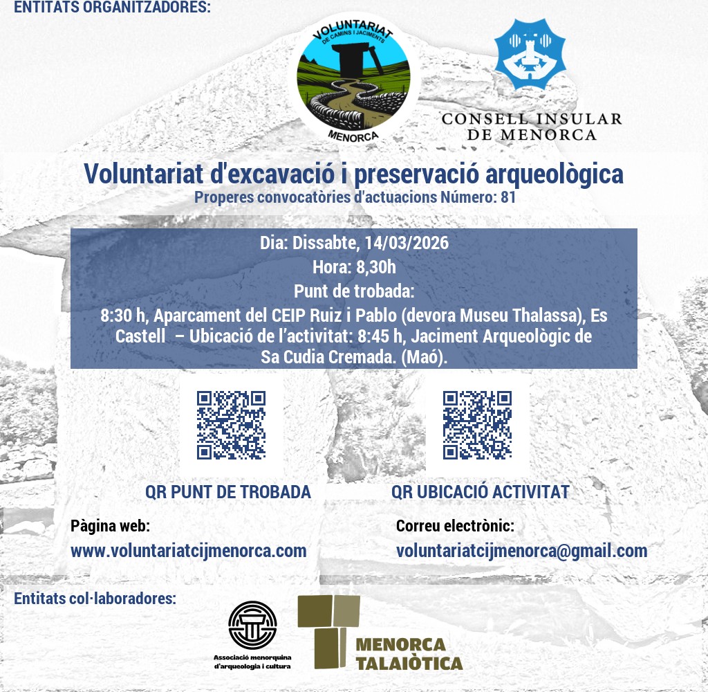 Punt de trobada: 8:30 h, Aparcament del CEIP Ruiz i Pablo (devora Museu Thalassa), Es Castell – Ubicació de l’activitat: 8:45 h, Jaciment Arqueològic de Sa Cudia Cremada. (Maó).